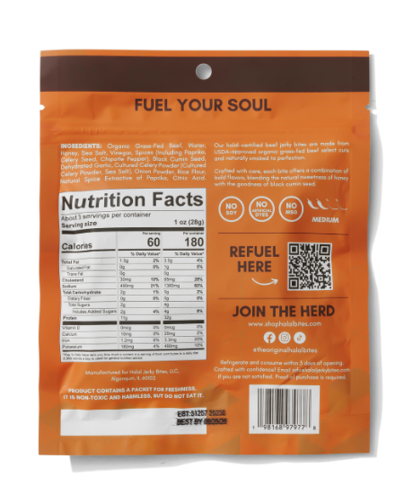 Original, Mango Habanero, Chipotle and Ghost Pepper Halal Bites ground and formed beef jerky bites are made with only select cuts of organic grass-fed beef, infused with honey and black cumin seed, and naturally slow-smoked to perfection.